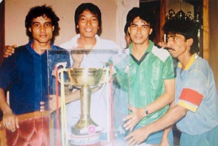 স্মৃতির পাতায় চ্যাম্পিয়ন ট্রফি হাতে নিয়ে বাম থেকে প্রয়াত কান্চন ও জুম্মান এবং আসির বর্তমানে আমেরিকা প্রবাসী ও আমি ইংল্যান্ডে। ছবি ১৯৮৯।